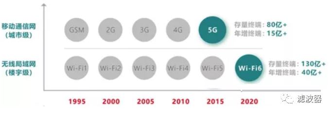 移动通信从90年代GSM开始,到2G、3G、4G 以及5G ,是三大运营商在城市中布了一个大家都可共享的无线网络。到2018年,移动通信网已经有80亿以上的用户,而每年新增的终端数量高达15 亿,到5G时代用户数和新增终端数将更多。无线局域网最成功的技术就是Wi-Fi。第一代的Wi-Fi1(11b)在1997年诞生,经历11b、11a、11g、11n、11ac以及11ax,2018年,Wi-Fi联盟统一用数字代号对Wi-Fi命名,也就是Wi-Fi1直到Wi-Fi6,其中Wi-Fi6在2018年正式开始商用。截止到2018年,Wi-Fi类的终端存量有130亿以上,包括大家使用的手机、平板电脑和PC,以及其他的智能设备。每年新增的Wi-Fi终端的数量超过40亿,是地球人类总数的2/3。